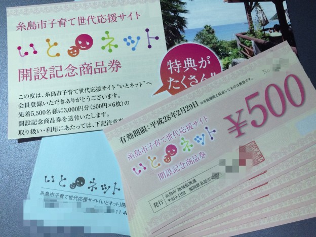 いとネットへ会員登録すると先着5500名に開設記念商品券(写真)が3000円分プレゼントされるということで早速登録し、先日届きました。